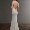 This sleek Martina Liana wedding gown boasts elegant pearl-beaded Guipure lace details, a low V neckline, and a sexy illusion back that zips up under pearl buttons. The skirt features scalloped lace details and a modest court train. SAMPLE WITH TAGS.