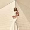 Embrace minimalist elegance with the Paloma Blanca Style 4980, a sleeveless wedding dress in crepe that speaks volumes with its bateau neckline and detachable bow. This gown is tailored for the bride who values simplicity and style in equal measure.